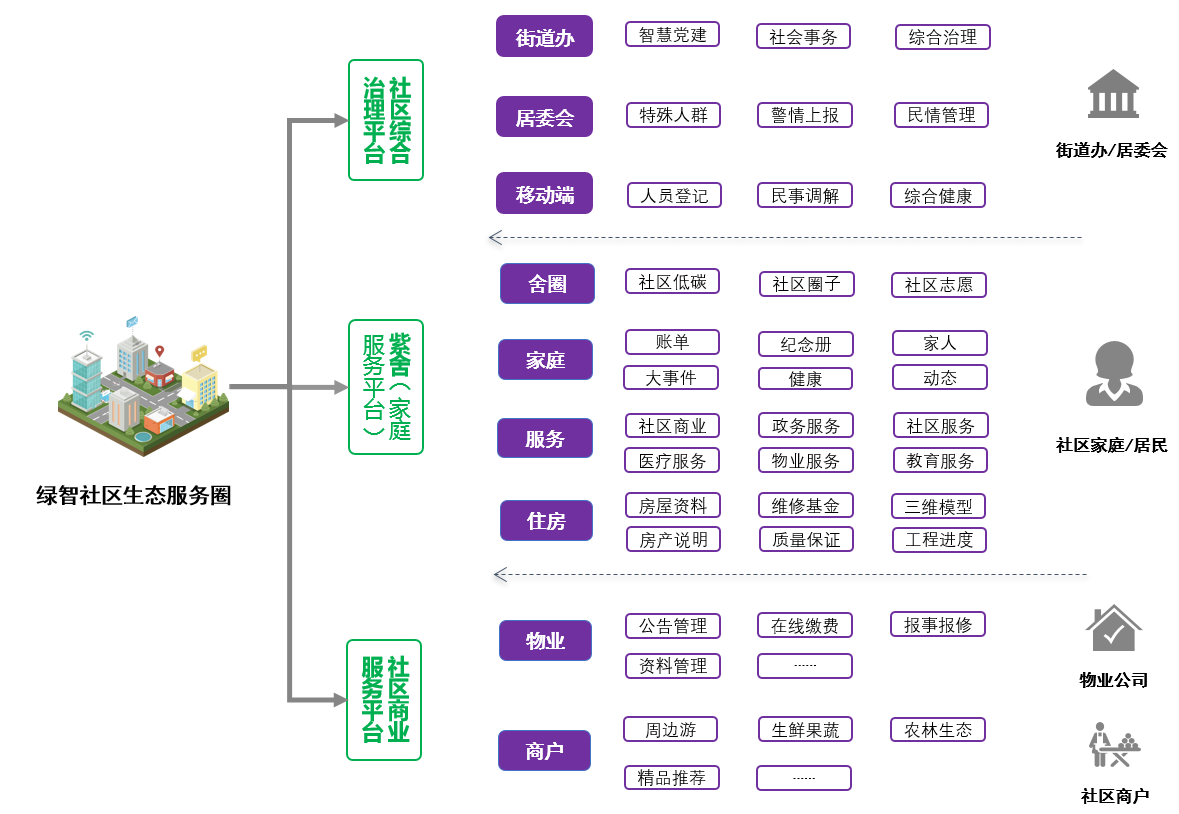 綠智社區平臺是構建以服務家庭為核心,融合物業、居委會、街道辦、商戶及相關政府部門服務及管理的智慧社區生態圈,本著便民、利民、助民為基礎,以新時代文明引領為方向,和美家庭、和睦鄰里、和諧社區為目標,塑造新服務、新治理、新公益、新商業為核心的整體綠色低碳智慧社區解決方案