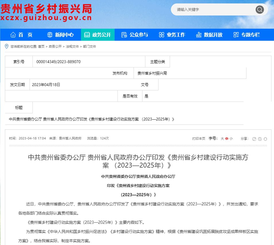 20234月,中共貴州省委辦公廳、貴州省人民政府辦公廳印發《貴州省鄉村建設行動實施方案(2023-2025年)》。