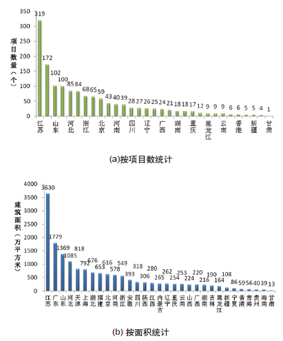 1446項綠色建筑標識項目按地域分布,由于經濟發展水平,氣候條件等因素,江蘇、廣東、山東、上海、河北等省市綠色建筑標識項目數量和項目面積較多(如圖5)。