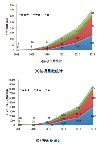 從項目數量和面積上來看,2008至2010年,綠色建筑標識項目數量和面積增長較緩慢,2011年至2013年增長速度很快,2013年的項目數量和面積與前五年的總和相當(如圖6)。其中,一星級和二星級綠色建筑的發展規模遠高于三星級綠色建筑的發展規模。