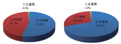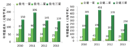 由上圖可看出,住宅建筑和公共建筑的單位面積增量成本均隨著星級的增高而增加,同時,一星級住宅與公建的單位面積增量成本相近,二星、三星級公共建筑的單位面積增量成本遠高于同星級住宅建筑。