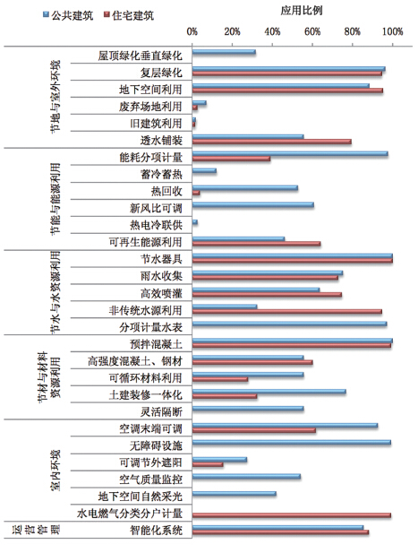 根據以往綠色建筑標識項目中提供了詳細技術應用數據的項目進行統計(其中,住宅建筑171項,公共建筑139項),對綠色建筑標識項目中的技術應用情況進行分析,如圖8。可以看出住宅類綠色建筑標識項目中,復層綠化、地下空間利用、節水器具、非傳統水源利用、預拌混凝土、水電燃氣分類分戶計量等技術的使用率較高;舊建筑利用、廢棄場地利用、余熱利用、可調節外遮陽使用率較低;公共建筑綠色建筑標識項目中,復層綠化、能耗分項計量、節水器具、分項計量水表、預拌混凝土、空調末端可調、無障礙設施等技術的使用率較高,廢棄場地利用、舊建筑利用、蓄冷蓄熱、余熱利用、熱電冷聯供等技術使用率較低。