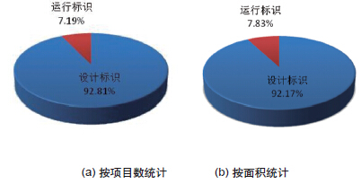 截至2014年1月,全國已評出1446項綠色建筑標識項目,總建筑面積達到16290萬m2,其中設計標識1342項,建筑面積為15014.17萬m2;運行標識104項,建筑面積1276.07萬m2(如圖1)。